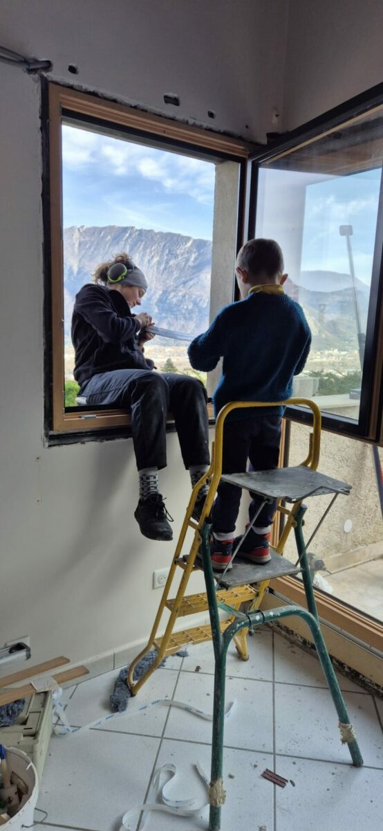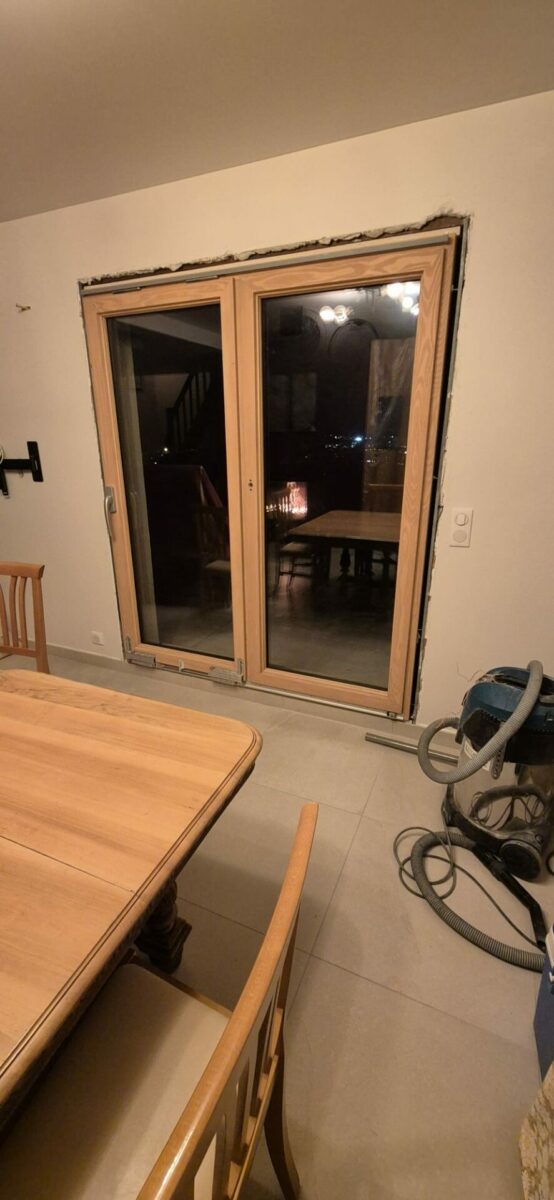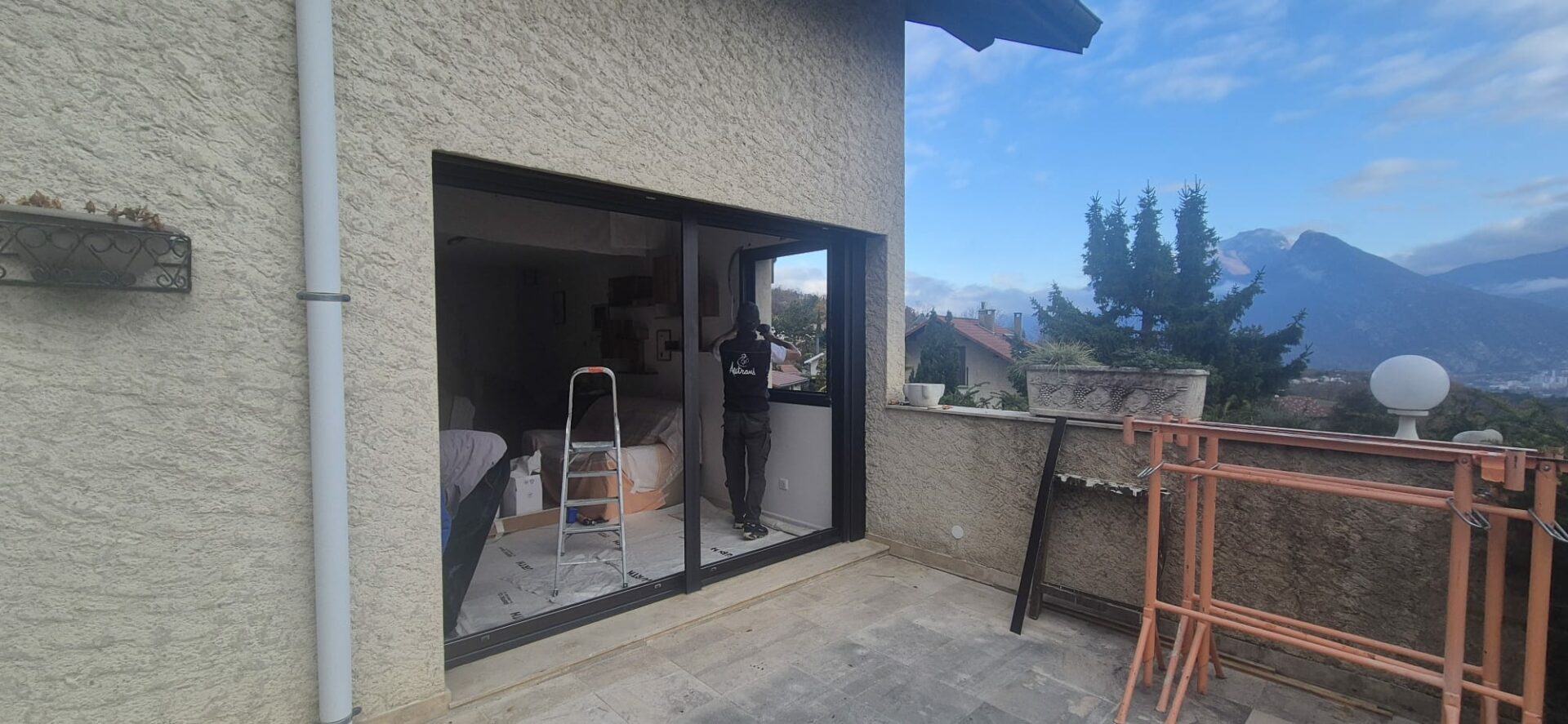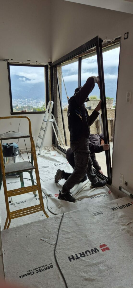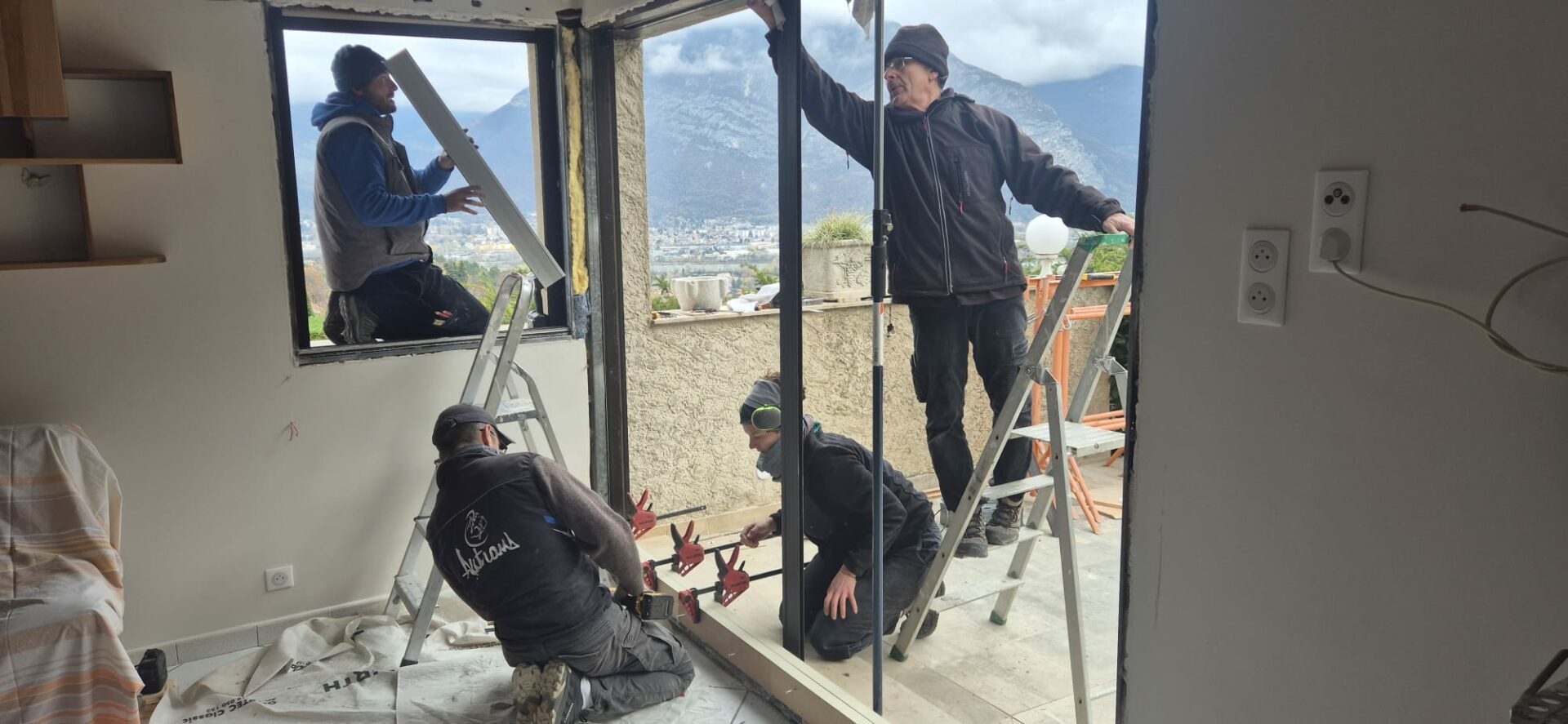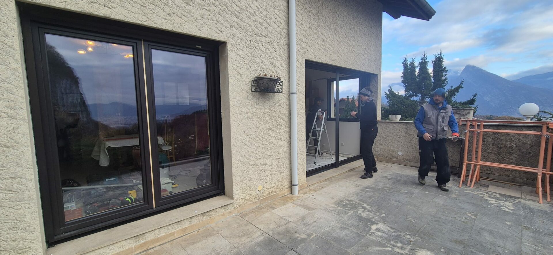 Très beau chantier participatif à Sassenage, où nous avons été sollicités pour remplacer des portes-fenêtres en aluminium coulissantes par des portes-fenêtres Caméléwood en bois et aluminium, double vitrage, coulissantes à translation.